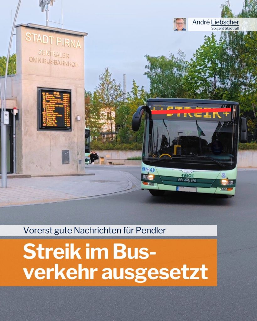 ℹ️ Unbestätigten Informationen zufolge, soll der Busverkehr im Raum Pirna am Dienstag bis 18 Uhr wieder anlaufen.
