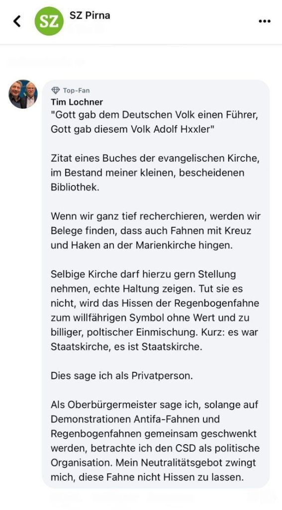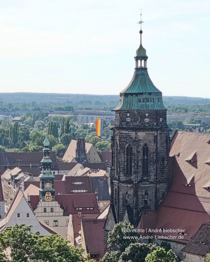 Die evangelisch-lutherische Kirchgemeinde Pirna bedauert, „dass die Regenbogenfahne nicht mehr, wie in all den Jahren davor, an Masten wehen darf, die in der Verantwortung der Stadtverwaltung Pirnas liegen.“ und springt ein. Nun weht die Regenbogenfahne nicht vor, sondern über dem Amtssitz von AfD-Oberbürgermeister Lochner.