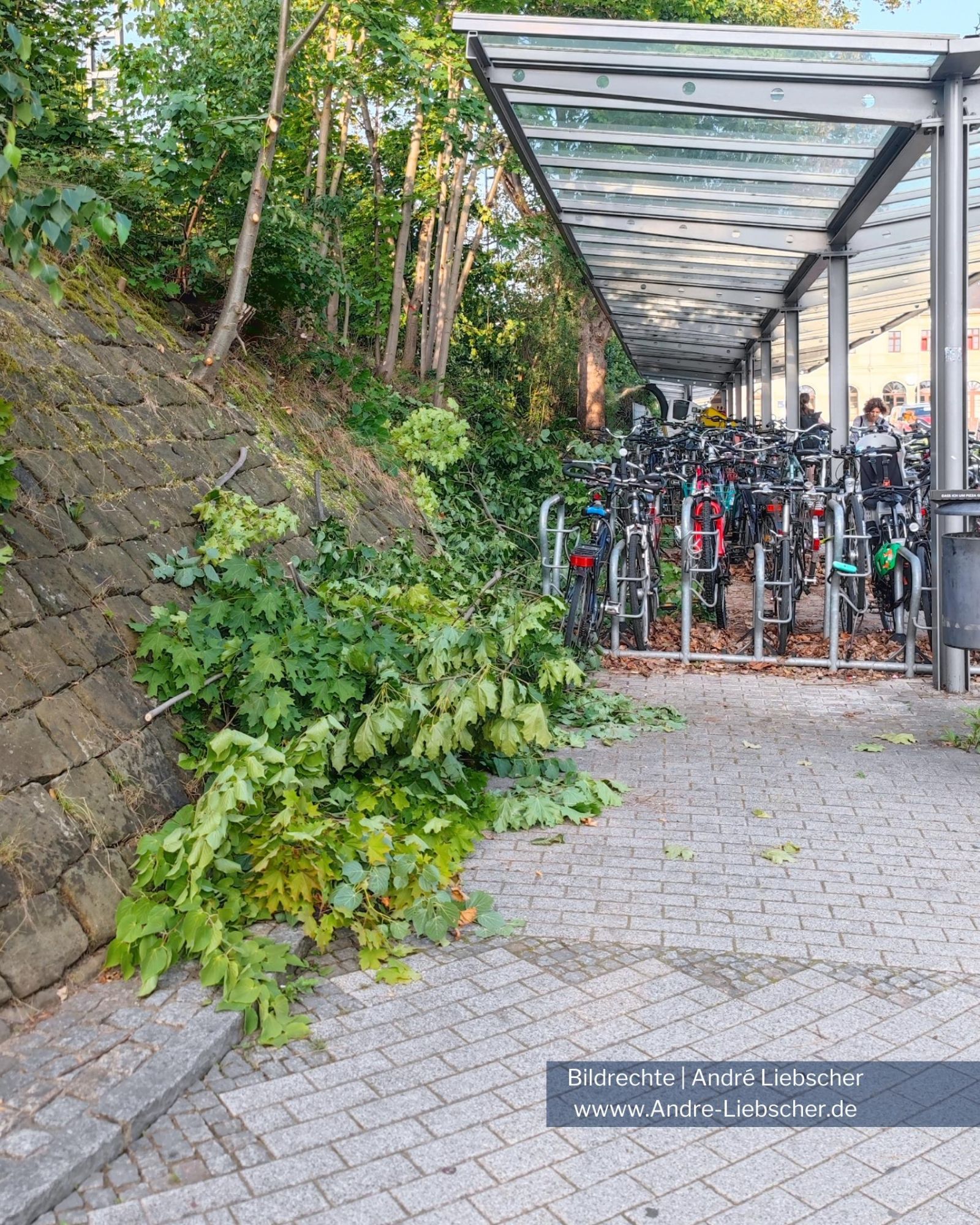 Seit heute morgen lässt die Bahn den Wildwuchs auf der Böschung an den Fahrradunterständen beseitigen.