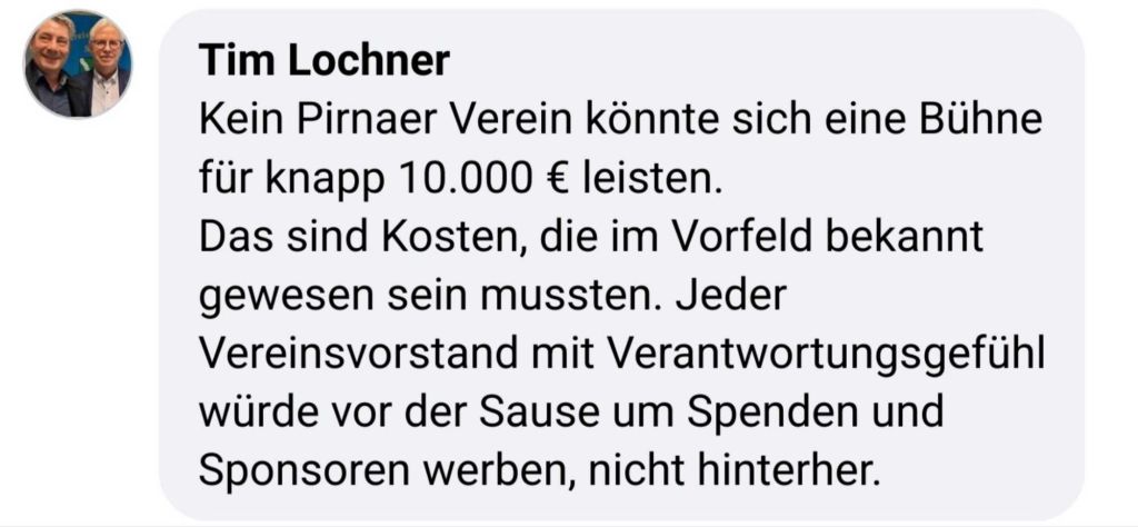 Dieser postet auf der Facebookseite der Sächsischen Zeitung, Ausgabe Pirna in mutmaßlich beabsichtigter Verkennung der tatsächlichen Ursachen der Geldnot kaum hilfreiche Ratschläge in Richtung des Vereins. Zudem kommt der Leser nicht umhin zu erahnen, wie sehr sich Lochner, der schon in seiner Zeit als AfD-Stadtrat gegen den CSD wetterte, in seinem kleinen Kämmerlein unter dem Dach des Rathauses darüber freut, dass der Verein um sein Überleben kämpfen muss.
