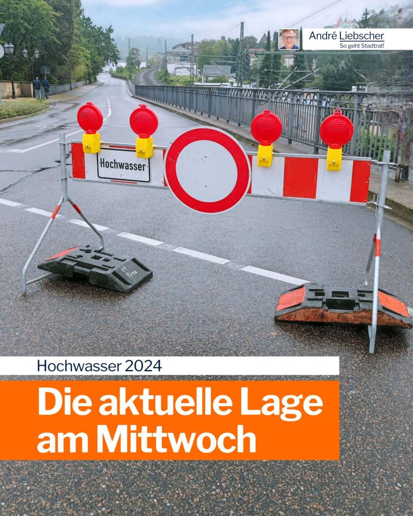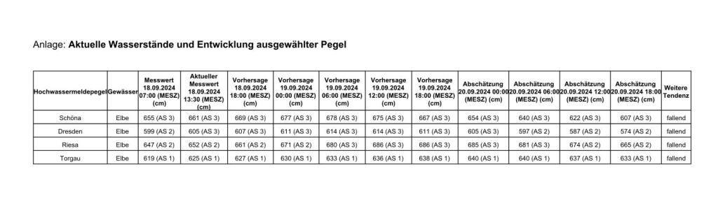 Nach der aktuellen Prognose (Mittwoch, 14.30 Uhr) wird der Hochwasserpegel in Pirna seinen höchsten Stand nun nicht am heutigen Mittwochnachmittag, sondern erst am morgigen Donnerstagmittag (19.09.2024) erreichen.