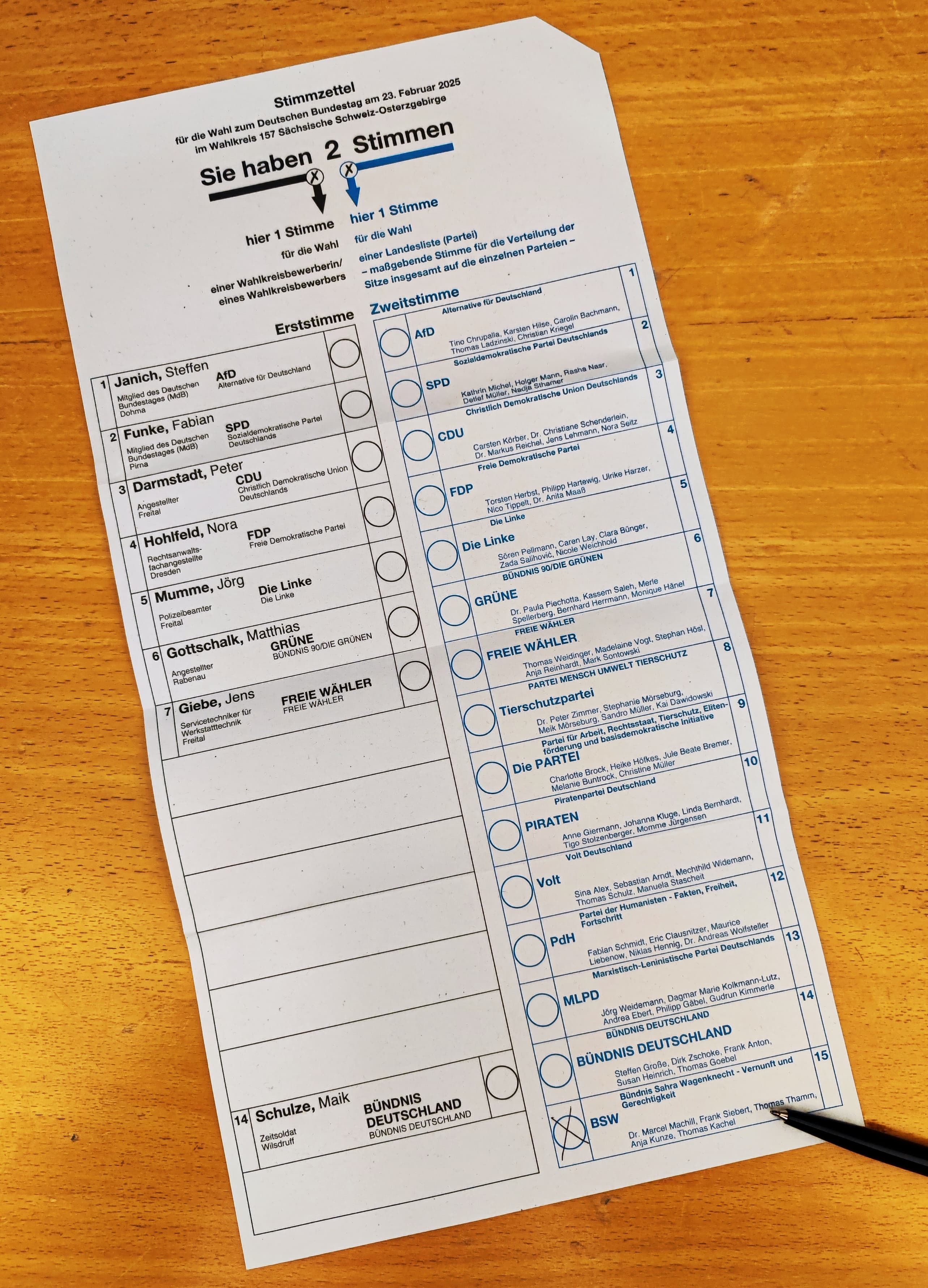 Die Zweitstimme ist entscheidend für die Sitzverteilung im Bundestag. Wenn das BSW die 5-Prozent-Hürde überwindet, sorgt dies dafür, dass die CDU und SPD oder Grünen nicht einfach eine Mehrheitsregierung bilden können.